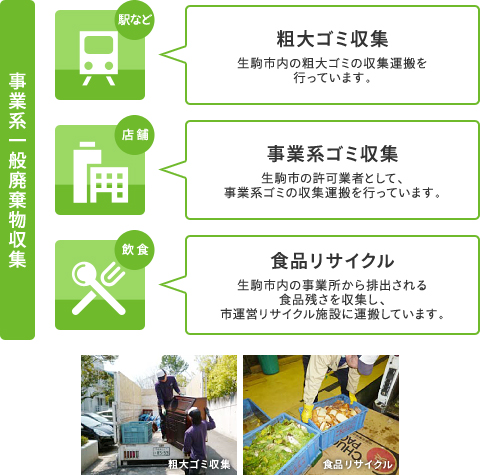 当社の業務内容とゴミの収集・運搬・リサイクルの流れ 生駒市衛生社がたずさわる主な事業内容をご紹介します。 収集される廃棄物のアイコンの上にマウスを移動させると、ゴミがどこに運ばれて、どのようにリサイクルされるかを表示します。